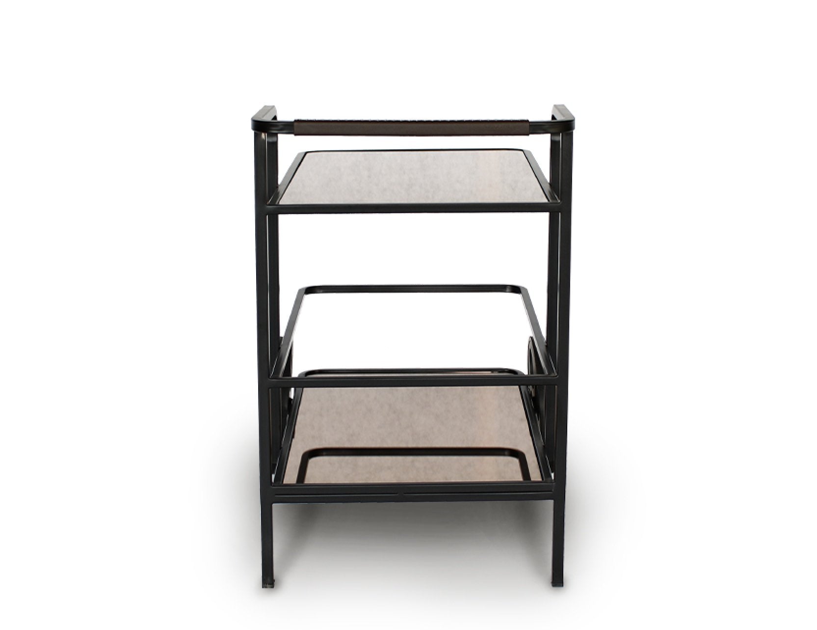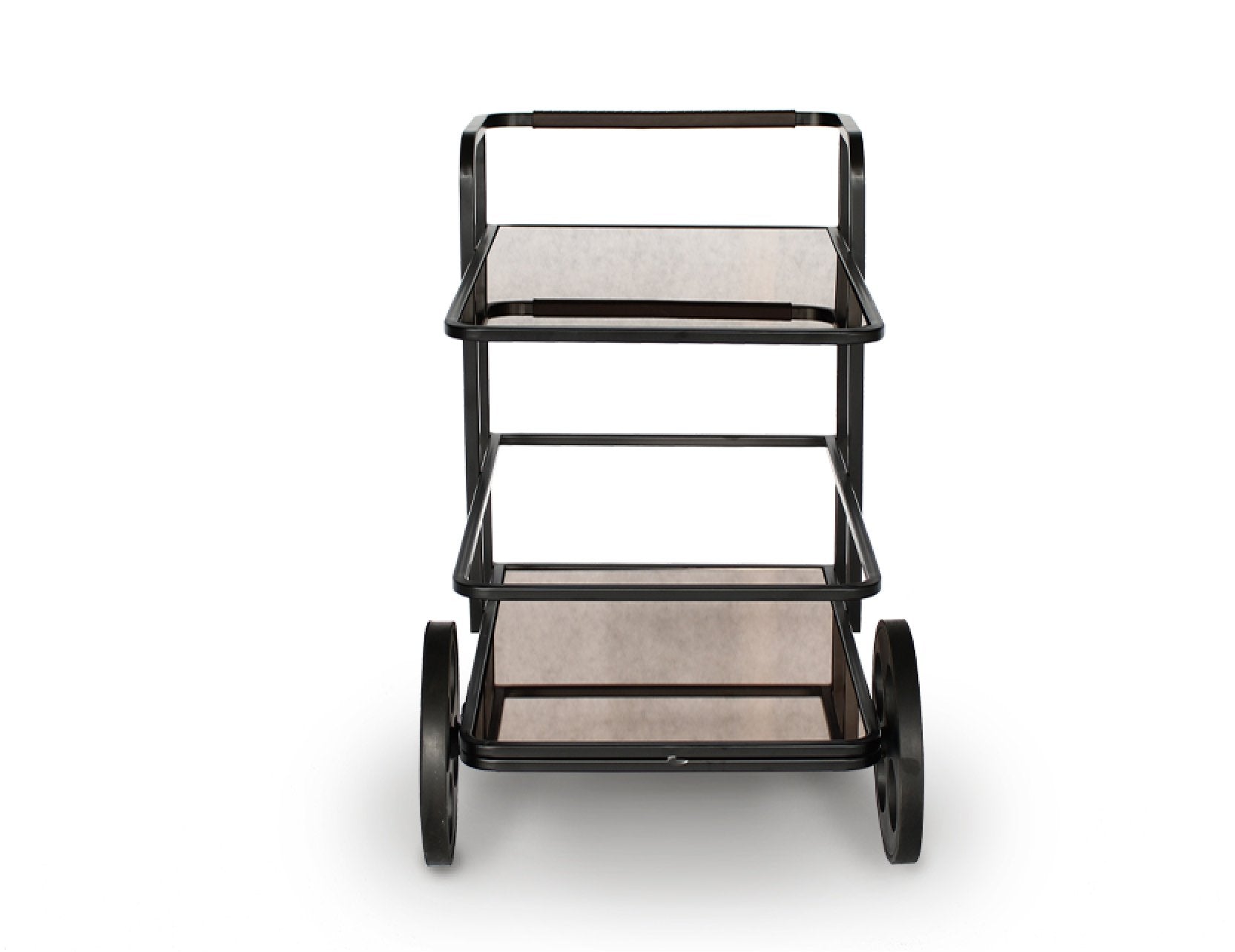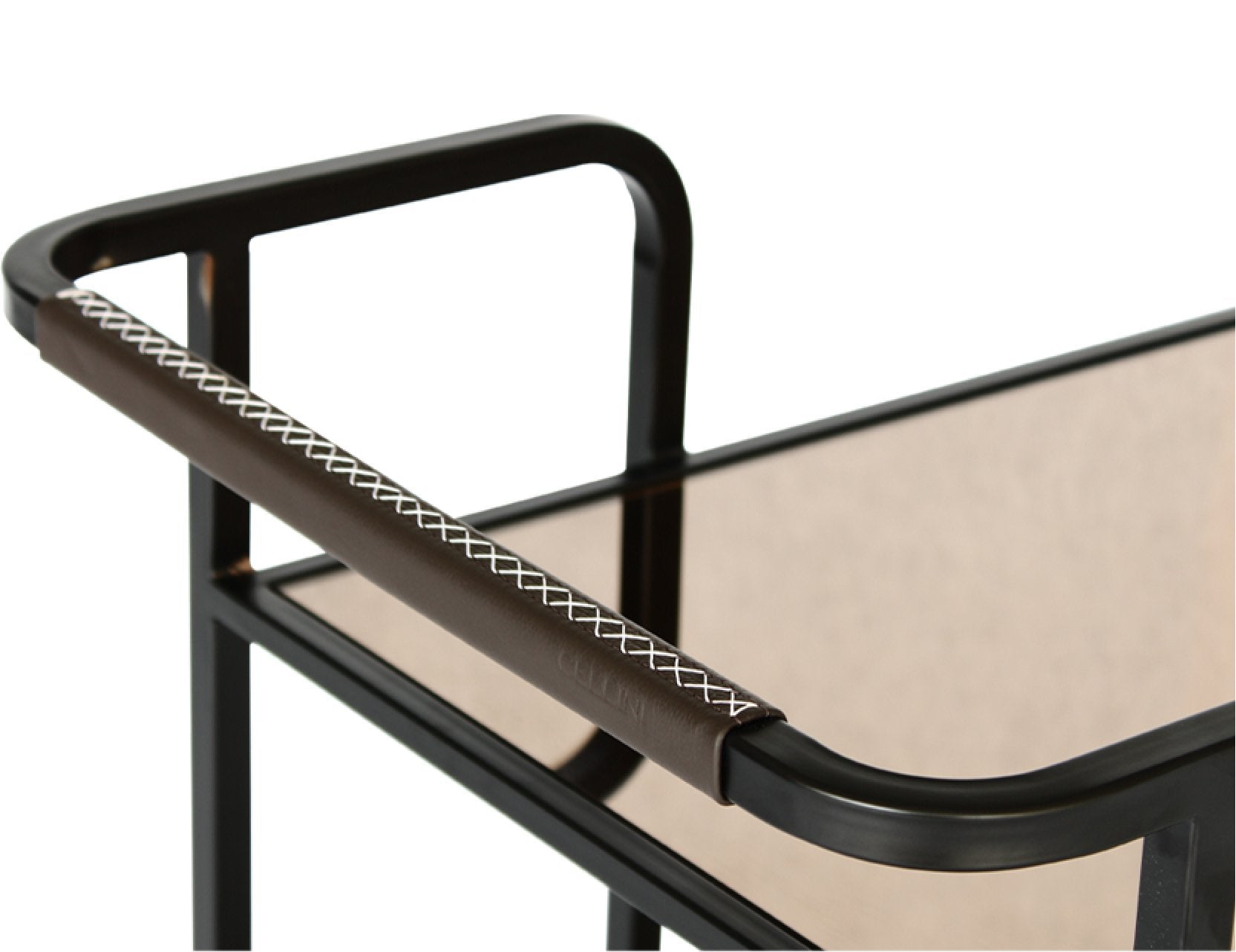 Servez avec style grâce au chariot à thé Assam, un élégant mariage de design et de fonctionnalité qui simplifie vos réceptions. Conçu pour les grands appartements et les maisons de plain-pied, cet accessoire de décoration allie un élégant plateau en verre miroir bronze, un cadre en acier thermolaqué noir et une poignée en cuir cousue main, aussi luxueuse qu'esthétique.