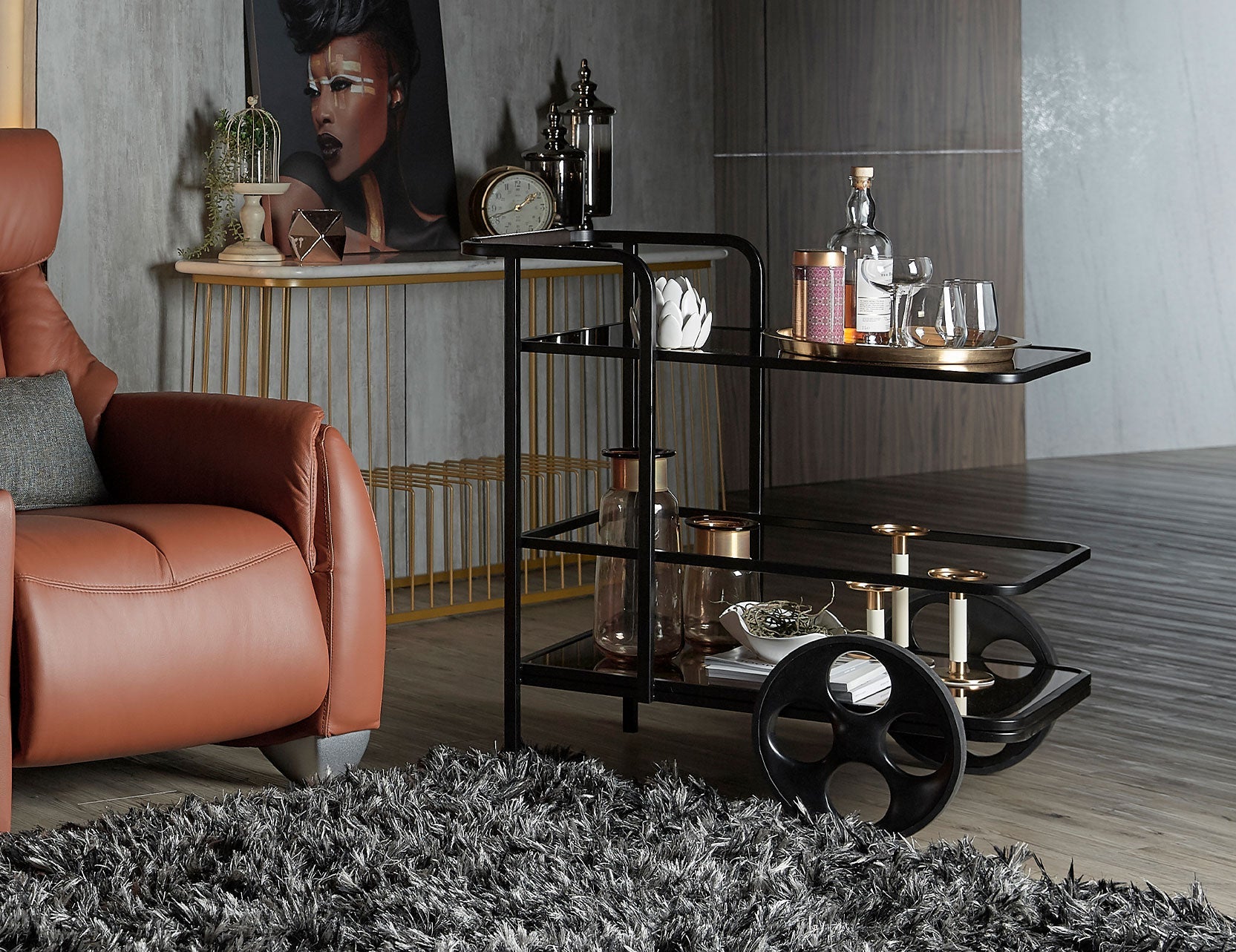 Roulez-le en douceur d'une pièce à l'autre grâce à ses pneus en caoutchouc, tandis que sa jante en aluminium moulé lui confère robustesse et une touche de charme industriel moderne. Que vous receviez des invités ou que vous l'utilisiez comme meuble d'appoint élégant, Assam sublimera chaque recoin de votre maison.