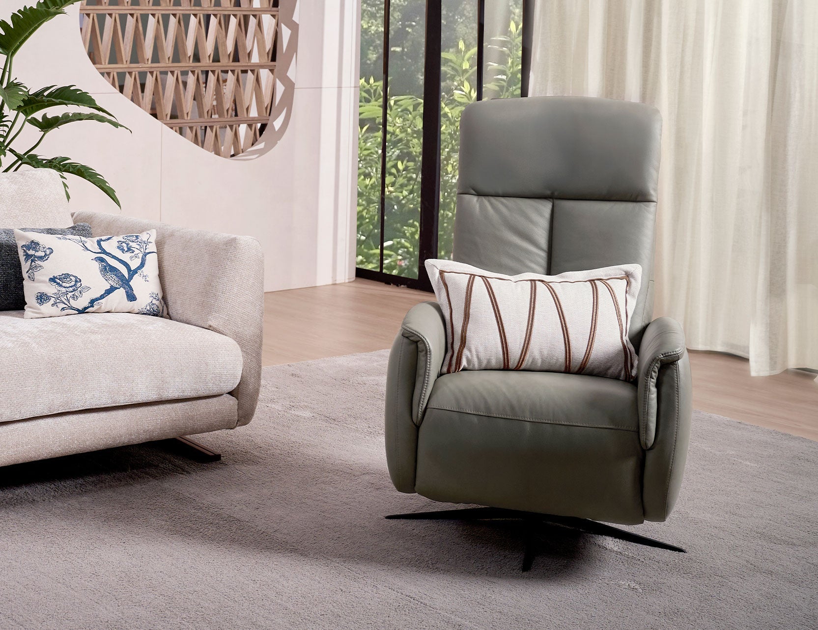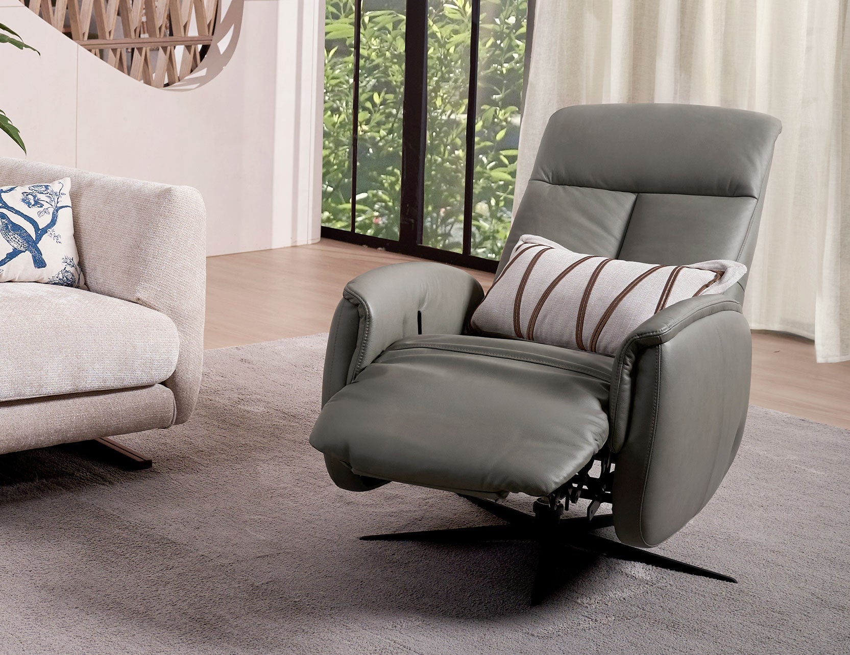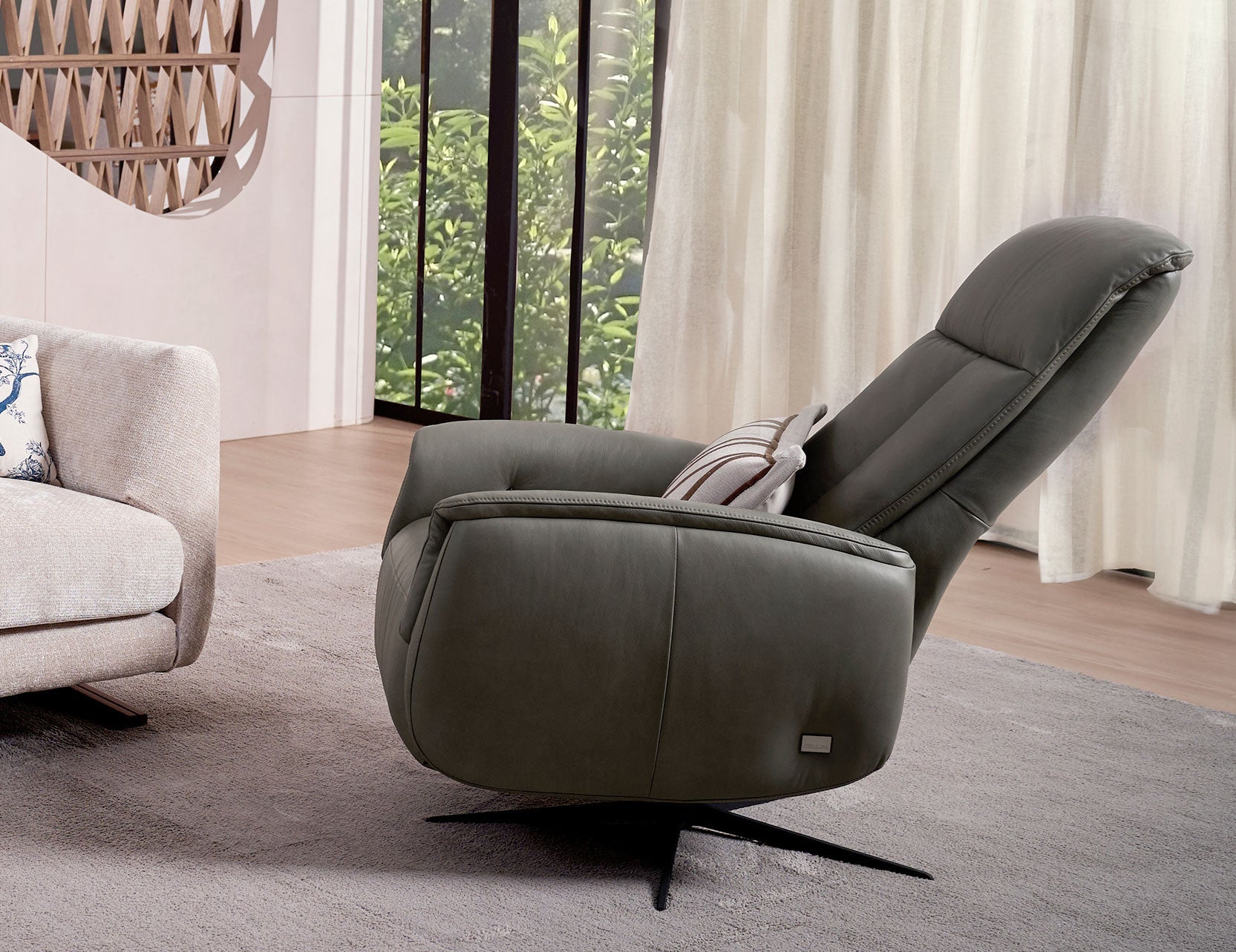 Grâce au mécanisme manuel RMT Lion Rock, vous pouvez passer en douceur d'une position assise à une autre : lecture et sommeil, grâce à des mouvements simples et naturels. En position entièrement inclinée, le canapé BERG offre une expérience d'assise en apesanteur, soulageant la pression et favorisant une relaxation profonde. L'appui-tête réglable manuellement assure un angle de vue idéal, même en position inclinée.