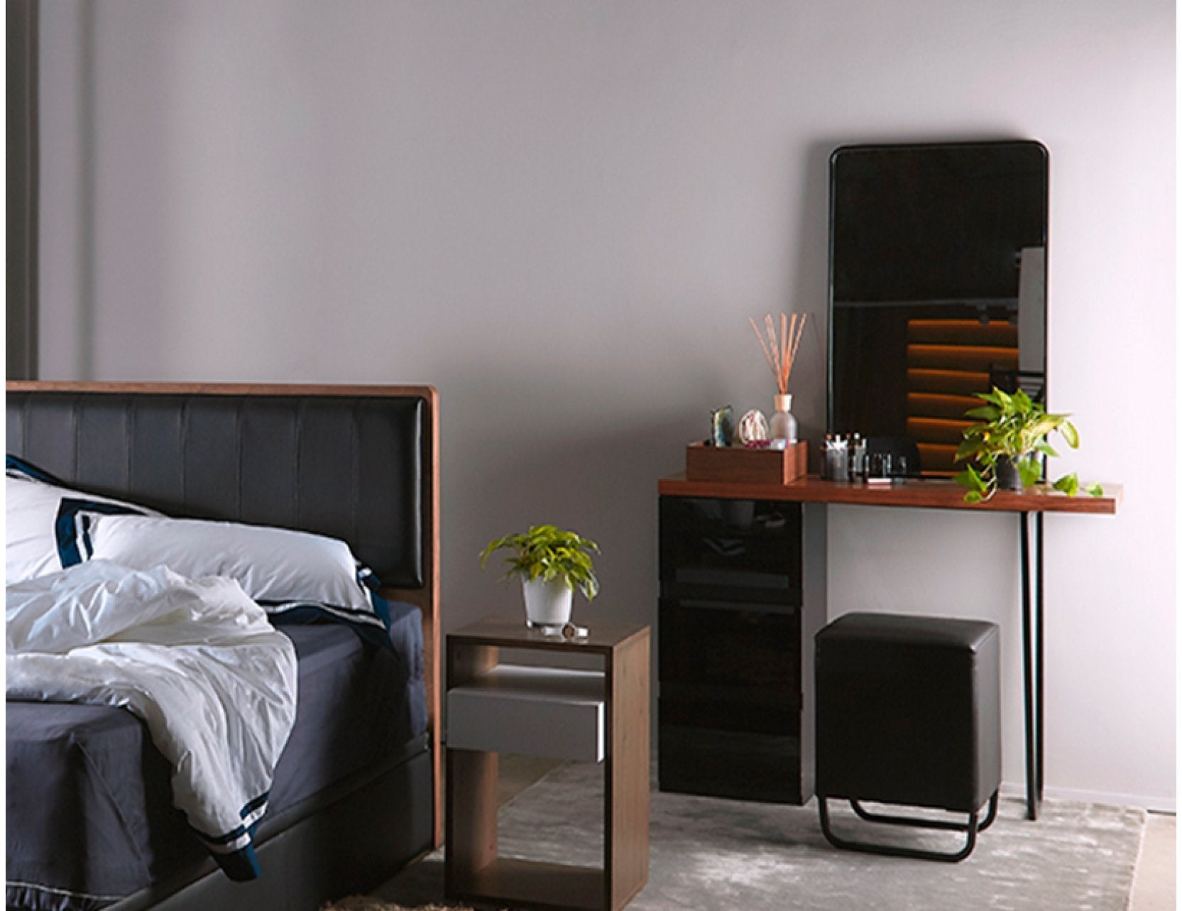 La coiffeuse DOL est l'endroit idéal pour se préparer, ranger ses essentiels et apporter une touche d'élégance à sa chambre. Ses grands tiroirs offrent un vaste espace de rangement pour votre maquillage, vos soins et vos objets du quotidien. Les façades noires brillantes des tiroirs brillent parfaitement, lui conférant une allure moderne et chic.
