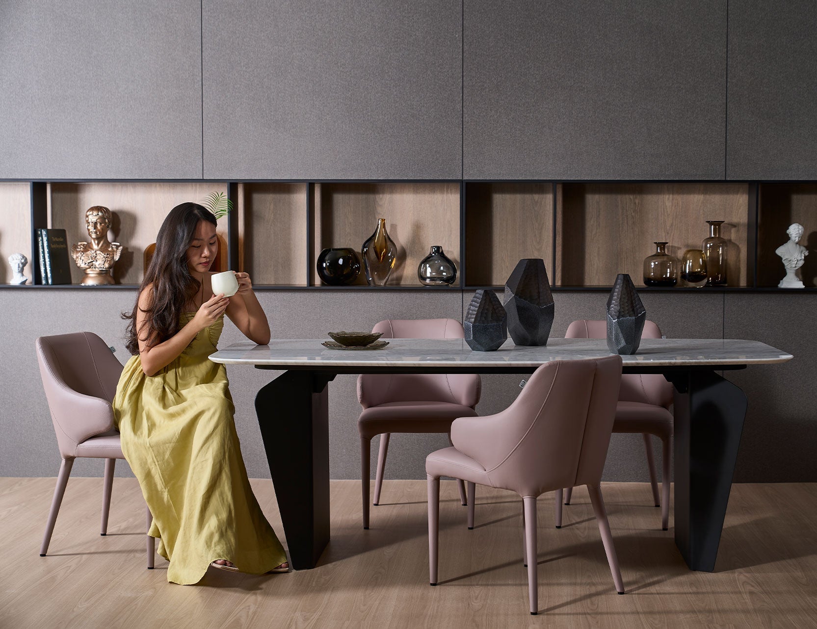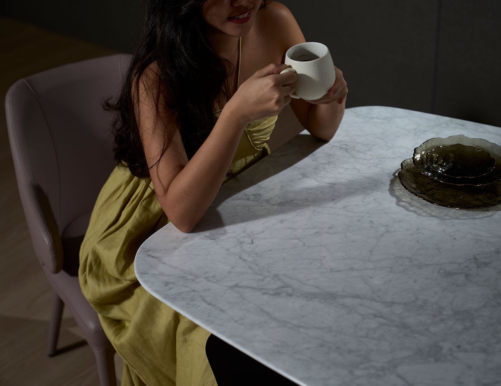 La table à manger FOLD est la pièce maîtresse idéale des intérieurs modernes, alliant style, durabilité et fonctionnalité. Avec son superbe plateau en quartz de Carrare, elle imite l'aspect luxueux du marbre, tout en offrant la praticité du quartz : robuste, durable et naturellement résistant aux bactéries.