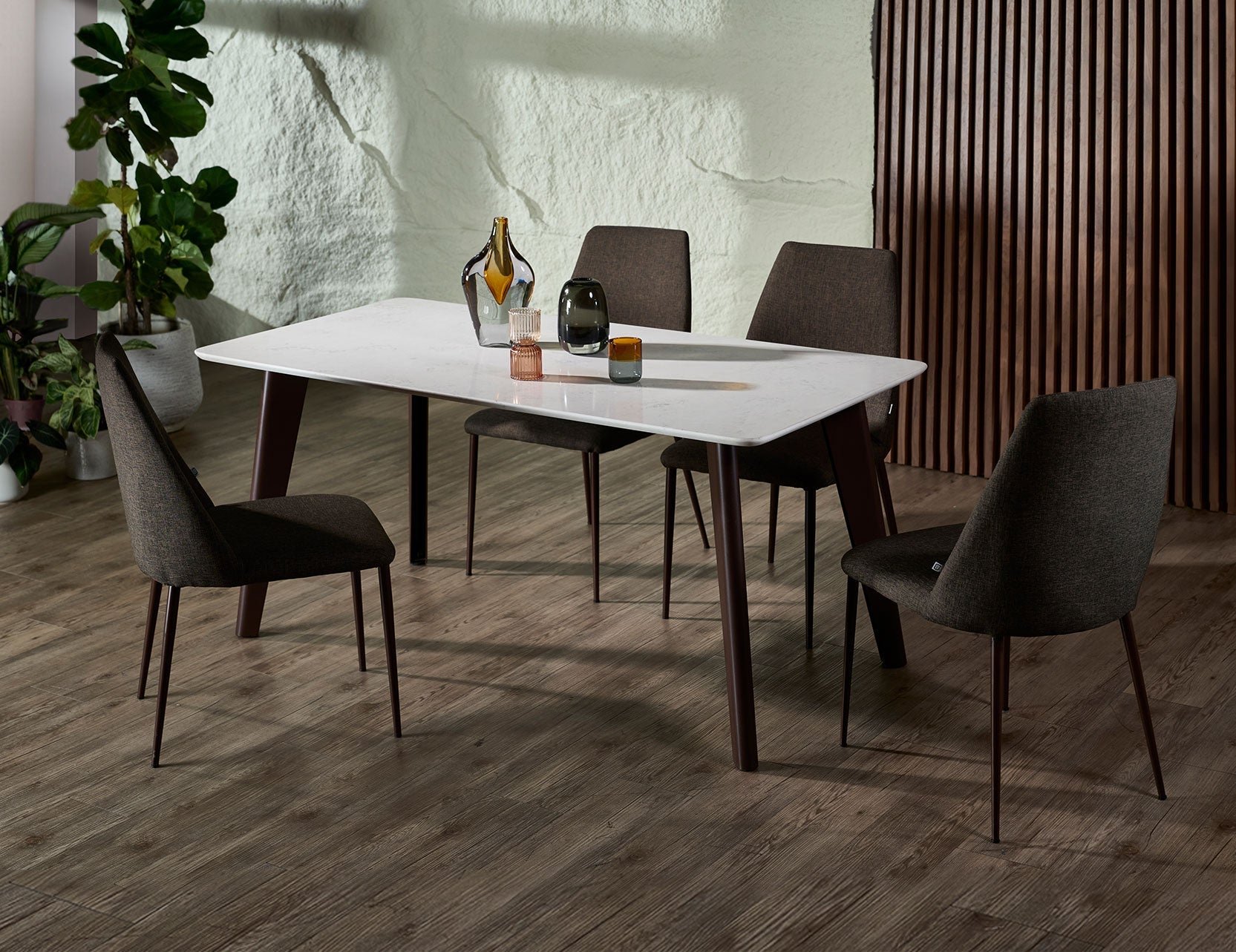 Le design de la base associe des pieds en acier noir texturé à des touches de marbre véritable, conférant à l'ensemble une allure élégante et authentique. Cet ensemble est livré avec des chaises assorties, offrant un style harmonieux, idéal pour les repas quotidiens comme pour les moments privilégiés. Facile à nettoyer, facile à apprécier, il est conçu pour les intérieurs qui recherchent style et praticité dans un ensemble élégant.