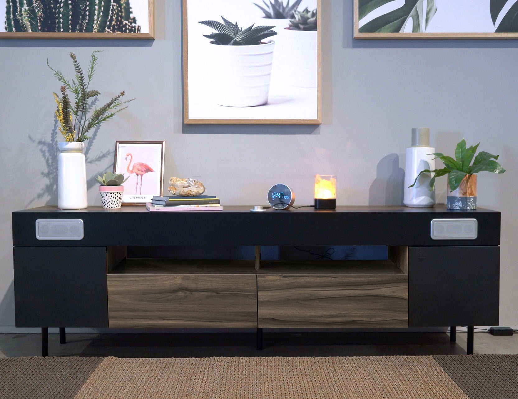 Découvrez le meuble TV MUSE, votre élégant meuble multimédia à la pointe de la musique. Fabriqué en noyer frappé MFM et finitions noir mat, et soutenu par d'élégants pieds en acier thermolaqué marron, MUSE est bien plus qu'un simple meuble TV : c'est une véritable déclaration.