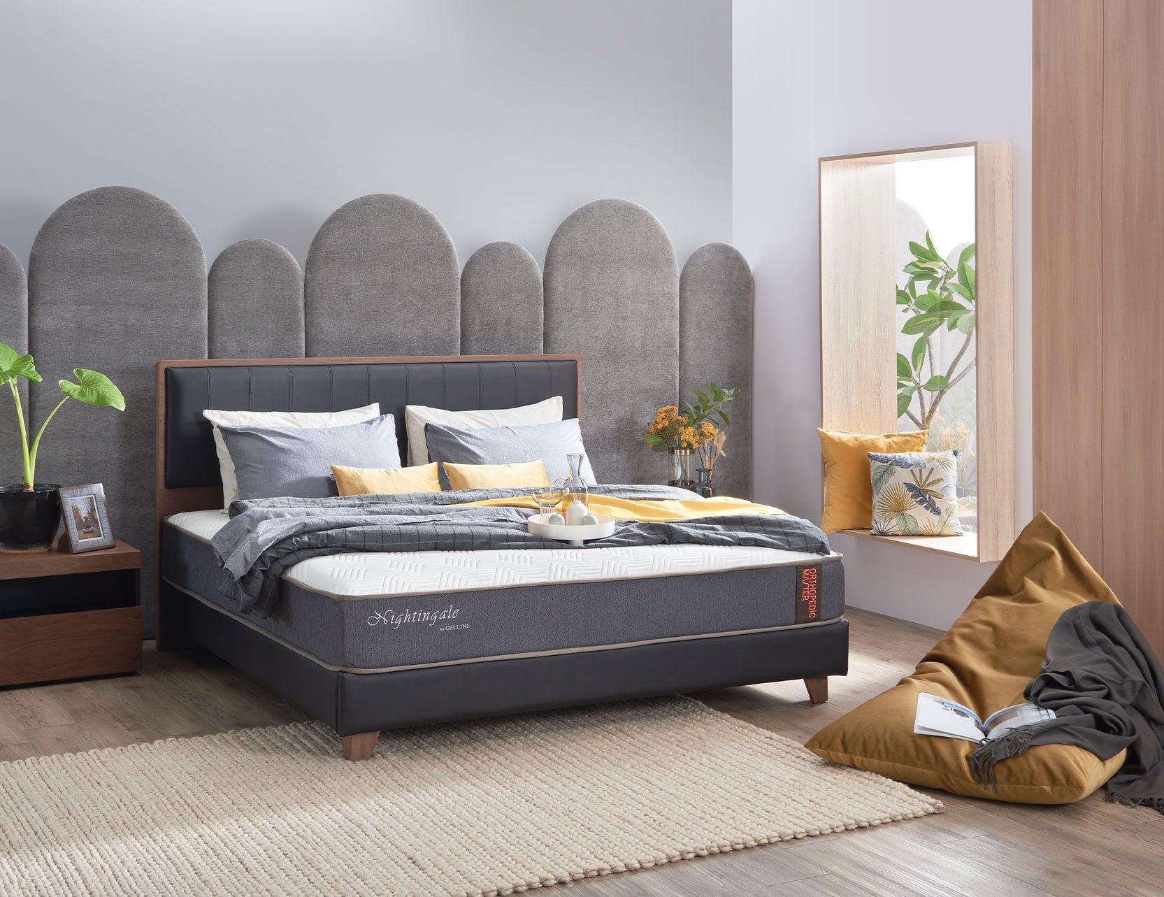 Le cadre de lit Trinity est doté d'une tête de lit au rembourrage moelleux et ornée de surpiqûres. Avec ses magnifiques touches de noyer pour un style moderne et épuré, ce cadre de lit sera un atout précieux pour votre chambre.